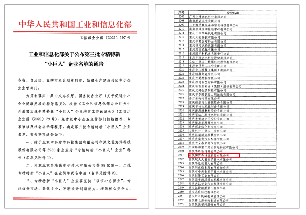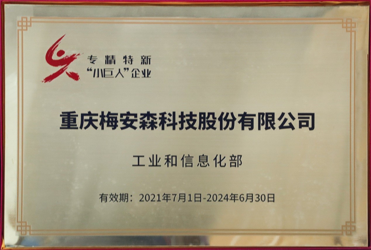 近日,重慶梅安森科技股份有限公司收到由工業(yè)和信息化部頒發(fā)的【國家級專精特新“小巨人”企業(yè)稱號】榮譽牌照。
