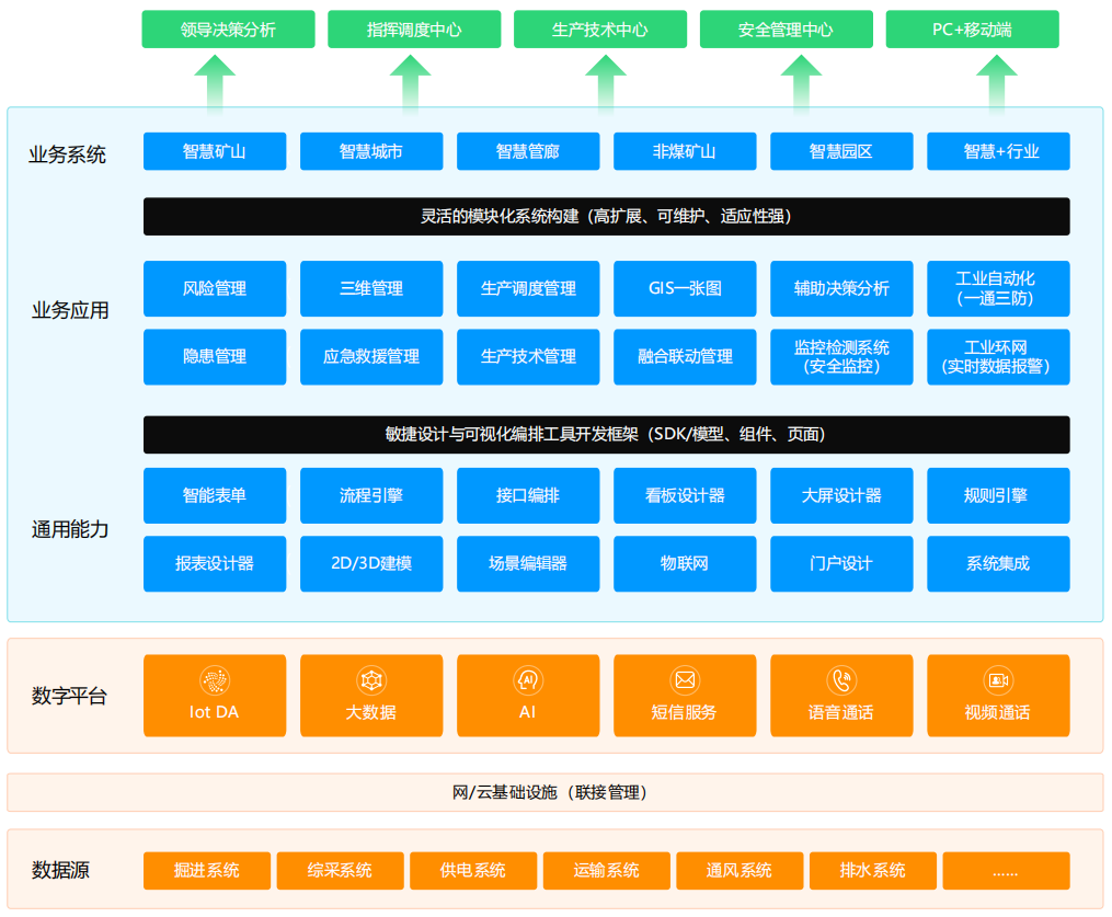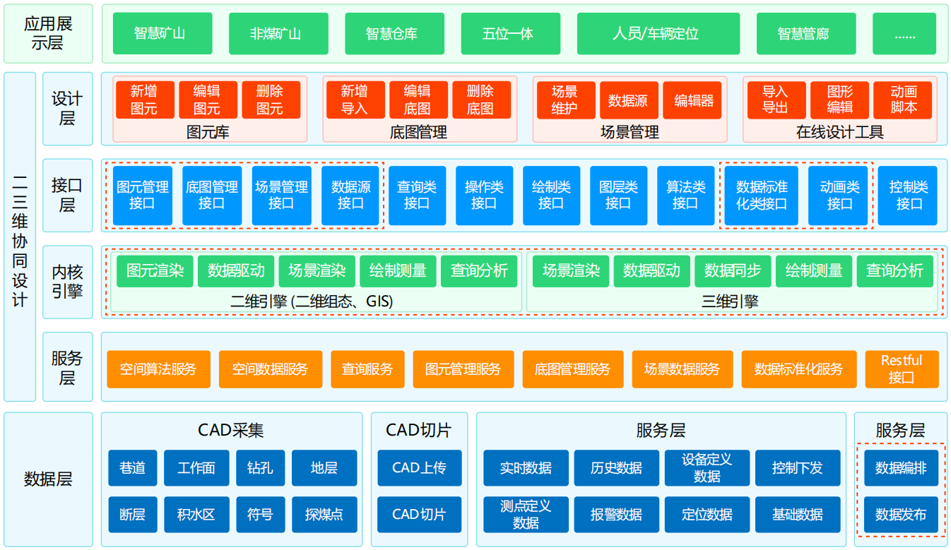 支持C/S和B/S架構(gòu),通過復(fù)雜地質(zhì)自動(dòng)三維建模、模型網(wǎng)格剖切、模型動(dòng)態(tài)更新、海量數(shù)據(jù)采集管理等關(guān)鍵技術(shù),為礦井地質(zhì)數(shù)據(jù)的可視化共享、動(dòng)態(tài)修正、智能開采、智能掘進(jìn)、智能管控、安全生產(chǎn)、地質(zhì)災(zāi)害預(yù)警等提供服務(wù)和指導(dǎo)依據(jù)。