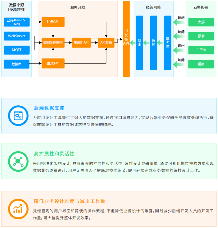 支持多源異構(gòu)數(shù)據(jù)源的統(tǒng)一接入與管理,實(shí)現(xiàn)異構(gòu)數(shù)據(jù)的無縫集成,通過數(shù)據(jù)編排處理能力,可對(duì)接口返回的數(shù)據(jù)進(jìn)行過濾、轉(zhuǎn)換、聚合等操作。以低代碼、高擴(kuò)展能力實(shí)現(xiàn)高效、靈活的數(shù)據(jù)集成與處理,顯著降低數(shù)據(jù)集成復(fù)雜度,滿足各種場景下業(yè)務(wù)數(shù)據(jù)處理需求,助力企業(yè)快速構(gòu)建、管理和發(fā)布標(biāo)準(zhǔn)化數(shù)據(jù)服務(wù)。