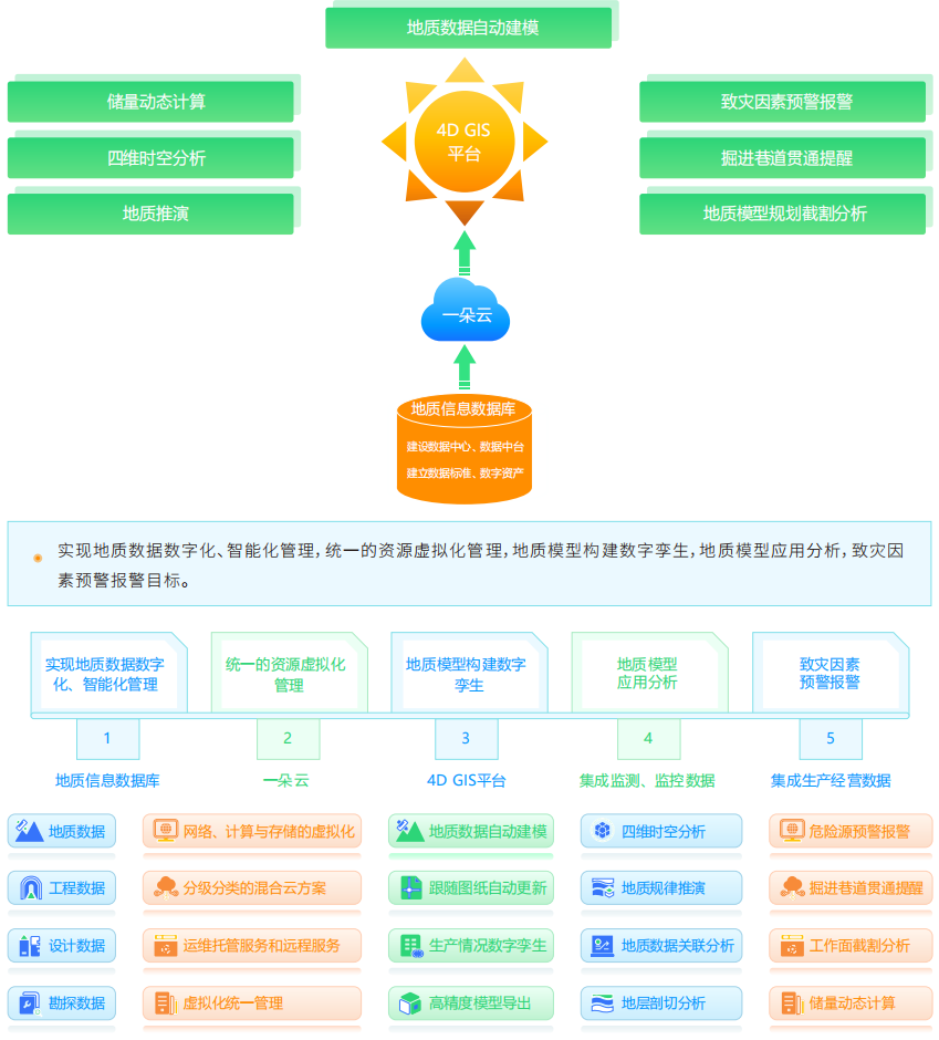 實(shí)現(xiàn)地質(zhì)數(shù)據(jù)數(shù)字化、智能化管理,統(tǒng)一的資源虛擬化管理,地質(zhì)模型構(gòu)建數(shù)字孿生,地質(zhì)模型應(yīng)用分析,致災(zāi)因素預(yù)警報(bào)警目標(biāo)。