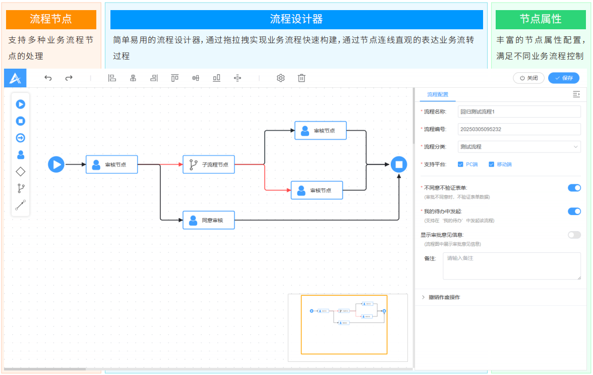 流程引擎實(shí)現(xiàn)企業(yè)級(jí)業(yè)務(wù)流程的自動(dòng)化、標(biāo)準(zhǔn)化和智能化管理,全流程留痕滿足審計(jì)與內(nèi)控要求,減少人工干預(yù),流程處理效率提升50%以上。通過圖形化界面快速設(shè)計(jì)復(fù)雜業(yè)務(wù)流程,支持多級(jí)審批、并行會(huì)簽、條件分支等場景,包括審批人(固定/動(dòng)態(tài))、抄送人、表單權(quán)限、操作按鈕等,滿足企業(yè)多角色協(xié)作需求。